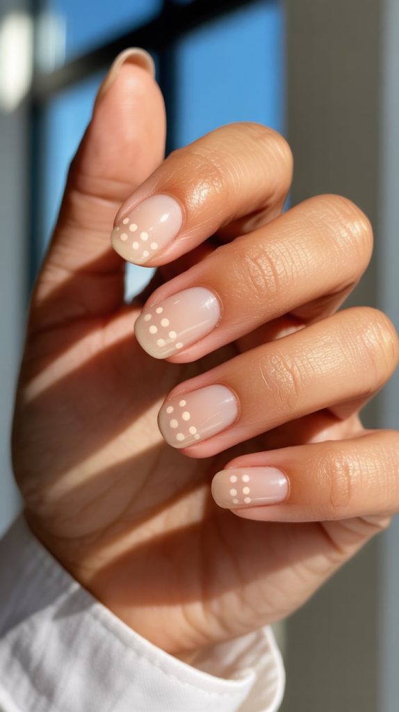 Dot art is having a major moment. Small white, gold, or black dots on a nude background offer a fun, playful edge. Whether you scatter them or stick to one or two nails, the effect is surprisingly elegant.